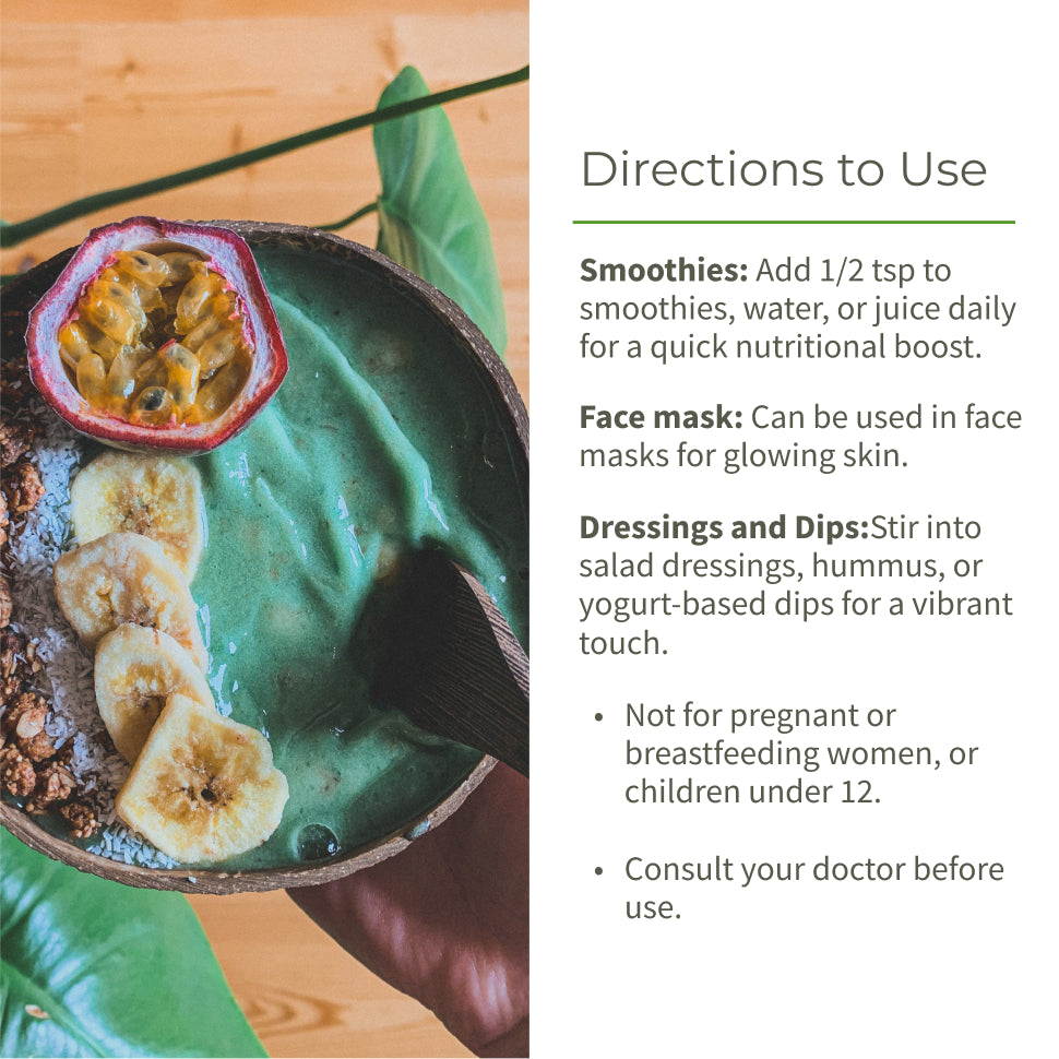 Boost your vitality with Ecotyl's Spirulina Powder - a nutrient-dense superfood derived from blue-green algae. Sustainably sourced and finely crafted, our Spirulina Powder is rich in protein, essential amino acids, iron, and powerful antioxidants that help detoxify and energize your body. An excellent support for immunity, endurance, and overall wellness, it blends effortlessly into smoothies, juices, or health bowls. Make this natural, plant-based powerhouse a part of your daily routine to elevate your energy and nourish your body from within!