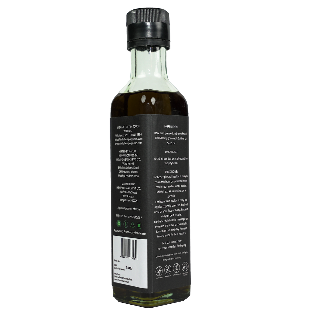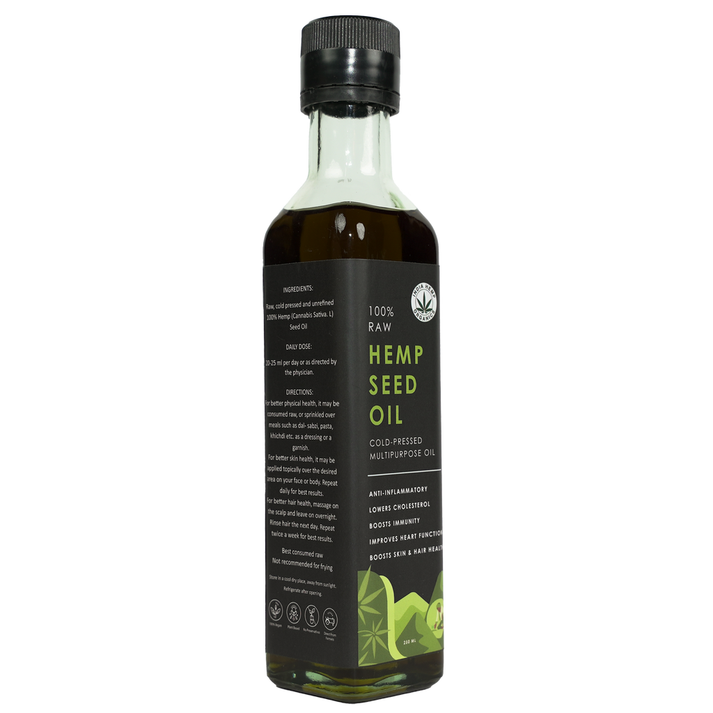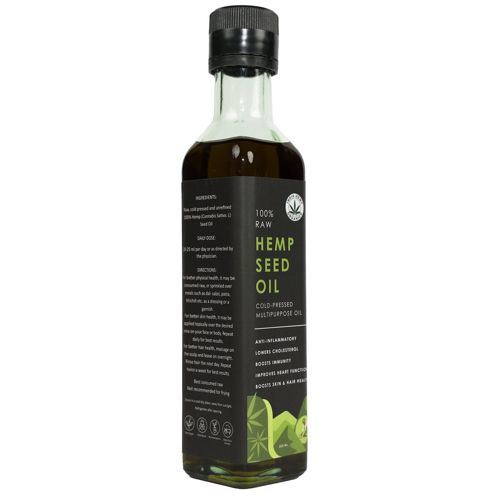 Best consumed raw as 2-3 tablespoons. Drizzle Hemp Seed Oil over your food and relish the nutty-earthy flavor along with its nutritional value. Sprinkle on salads, rice-daal, sabzi, hummus & dips, pasta or any other food you're enjoying at the moment.