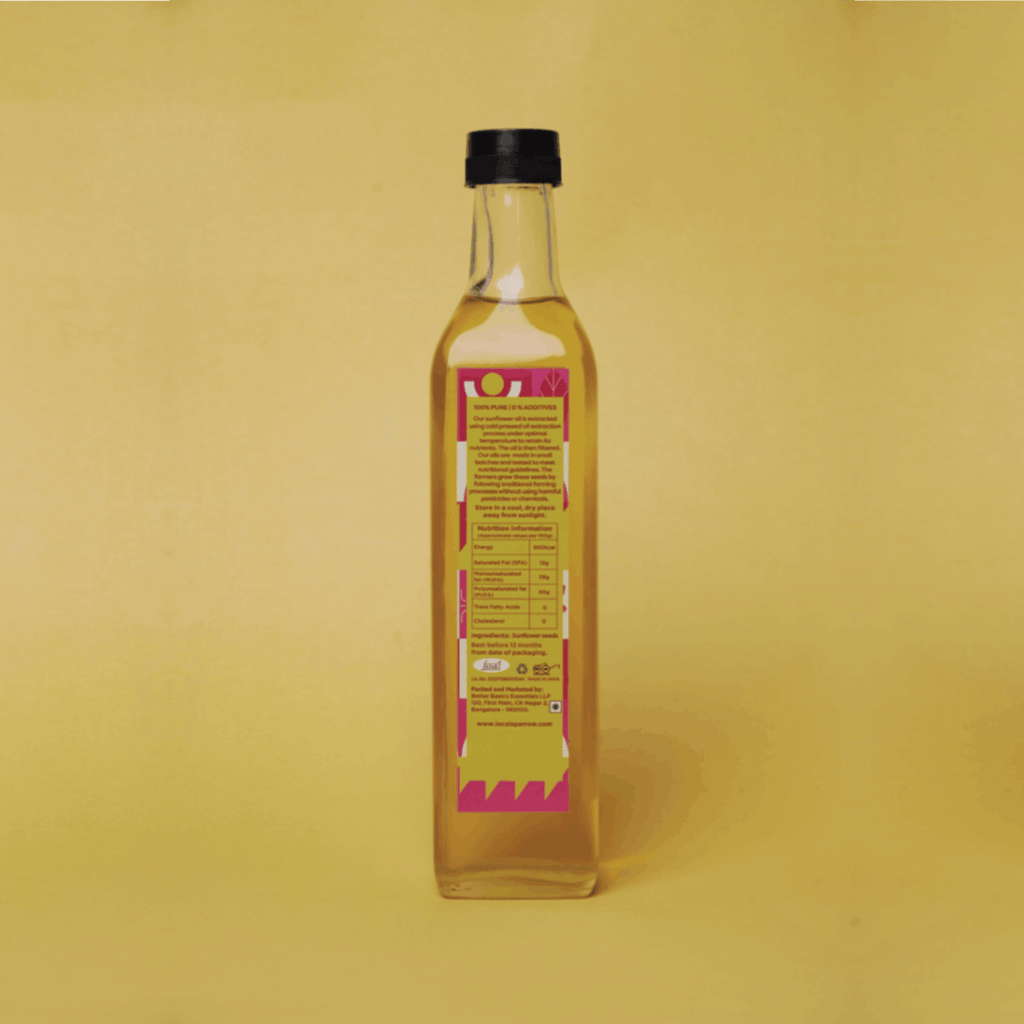 Our sunflower oil is extracted from certified organic sunflower seeds by cold pressed method under optimal temperature to retain its nutrients. The oil is then filtered using organic oil filtering processes. Our oils are made in small batches and tested to meet nutritional guidelines. The color of the oil may vary depending on the seeds which is completely normal. We do not add any colors or flavours to bring in an artificial consistency in our products.
