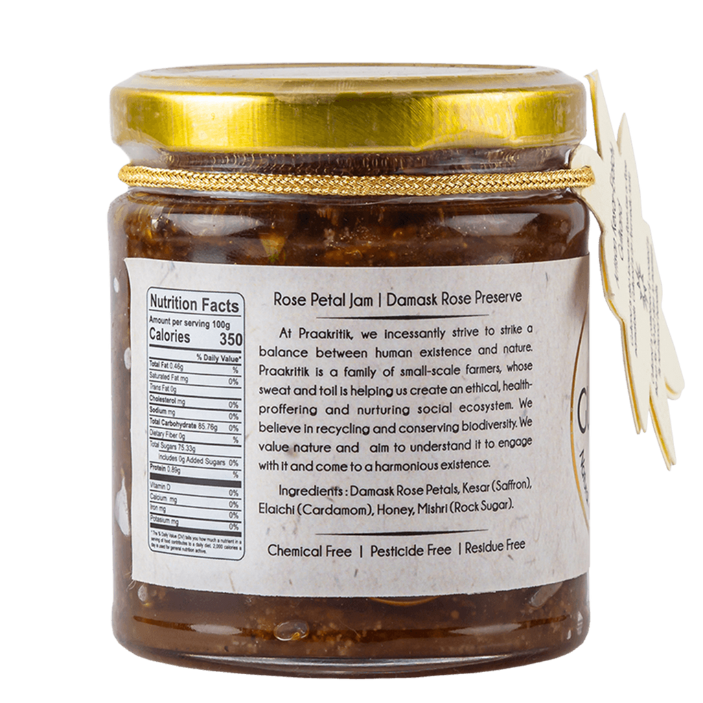 Our Indian Damask Pink Rose Comes from the Foothills of Pushkar, Rajasthan. We use autumn bloomed rose petals which bloom twice a year. This Gulkand is made from fresh rose petals and mishri (unrefined form of sugar) which has its own medicinal values. All the ingredients are combined and cooked in the sun taking 50-60 days to make this Artisanal Gulkand with maximum nutritional benefits.