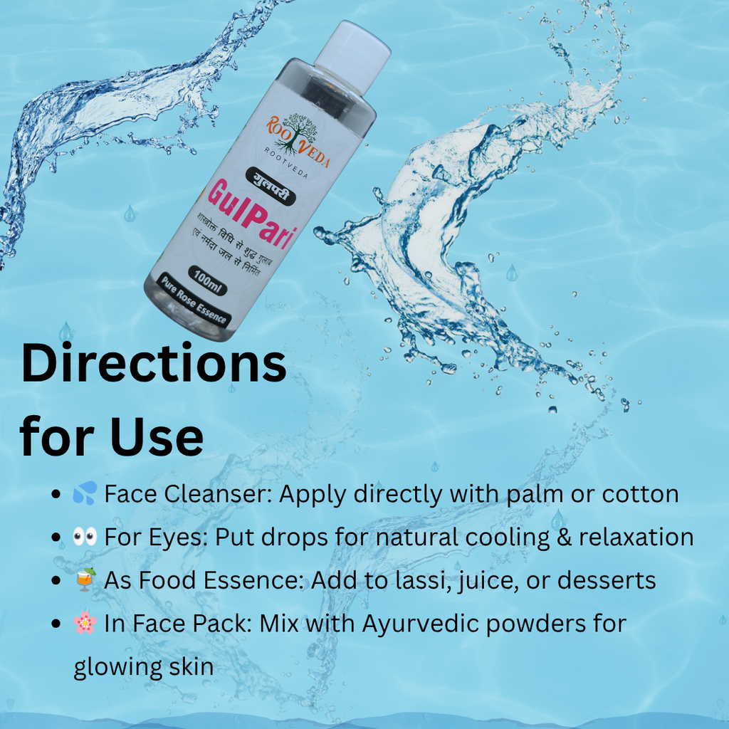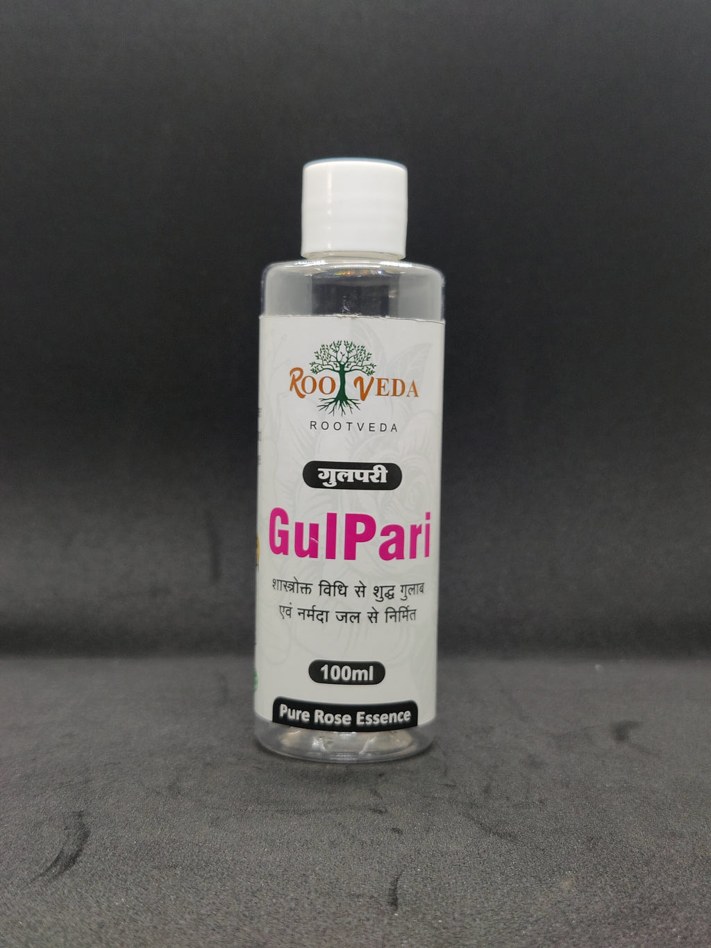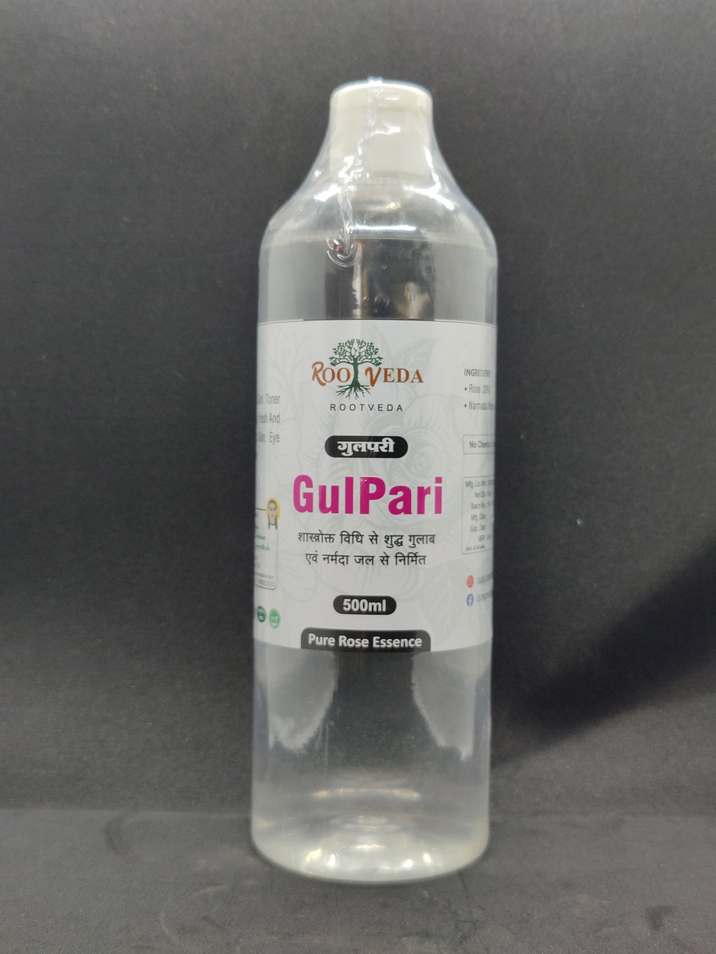 RootVeda Gulpari is a 100% Ayurvedic rose water made from pure Narmada river water and selected fresh roses. It is specially crafted to soothe, hydrate, and refresh the skin naturally. Its gentle formula helps in toning the skin, reducing redness, and providing a natural glow. Perfect for daily skincare, RootVeda Gulpari can be used as a facial mist, toner, or for refreshing the face and body anytime.