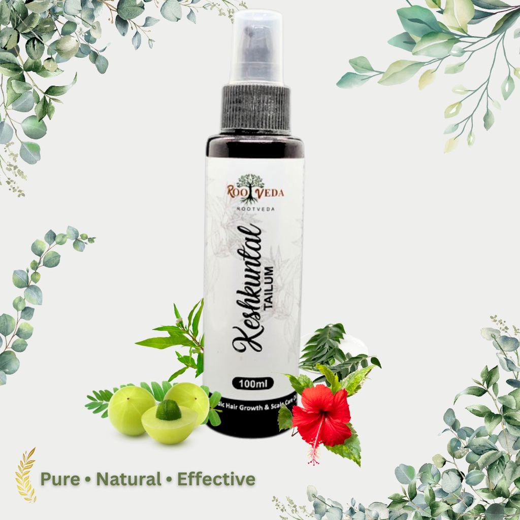 RootVeda Keshkuntal Tailum is 100% ayurvedic hair oil. It is prepared with JATAMASI, BHRIGRAJ, and other natural ingredients. RootVeda Keshkuntal Tailum is a natural hair oil infused with a unique blend of Ayurvedic herbs and oils. This potent formula nourishes the hair from root to tip, promoting hair growth, preventing hair fall, and reducing dandruff. It strengthens the hair follicles, adds shine, and improves the overall health of the scalp. Keshkuntal Tailum is suitable for all hair types and is free from harmful chemicals and preservatives. This oil helps in repairing hair, thickens hair, and prevents hair fall. It can be used daily. Results have shown that regular usage of this oil helps in hair growth, preventing hair fall, thickens hair, and keeps the scalp healthy. It is 100% ayurvedic with no side effects.