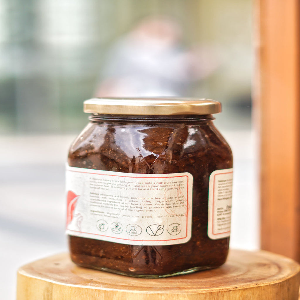 Rose petals are rich in vitamin C, iron and antioxidants and our homemade and handmade Gulkand is made with our organically farm grown roses and raw forest honey making it fragrant and delicious.