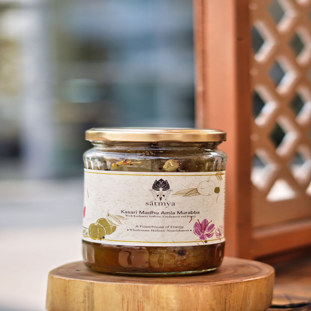 The Sātmya Murabba: honey saffron dusted amla infused with cardamom is extremely beneficial for your health and perhaps the best way to feed the usually bitter fruit to kids as honey gives it a healthy sweetness.