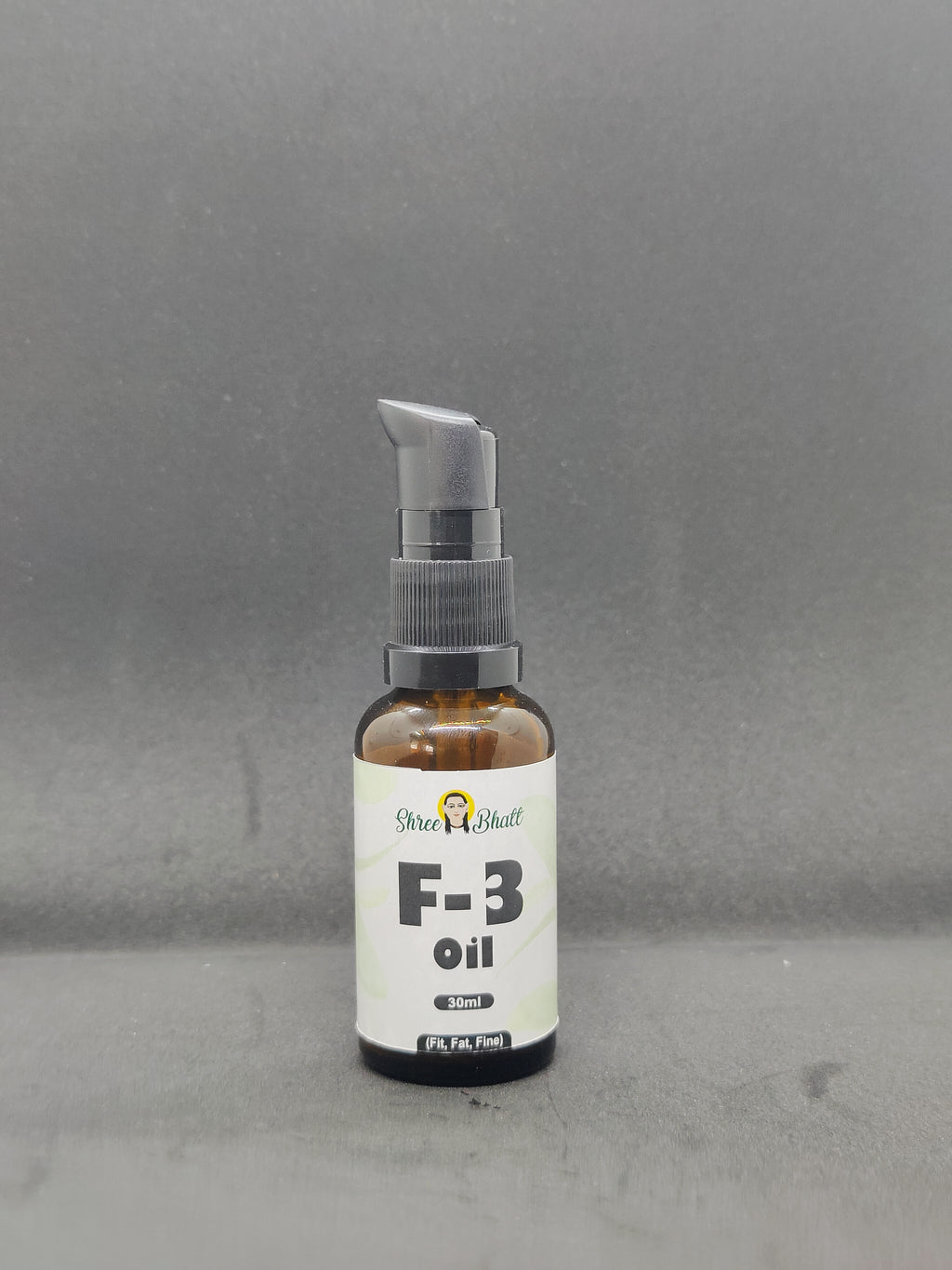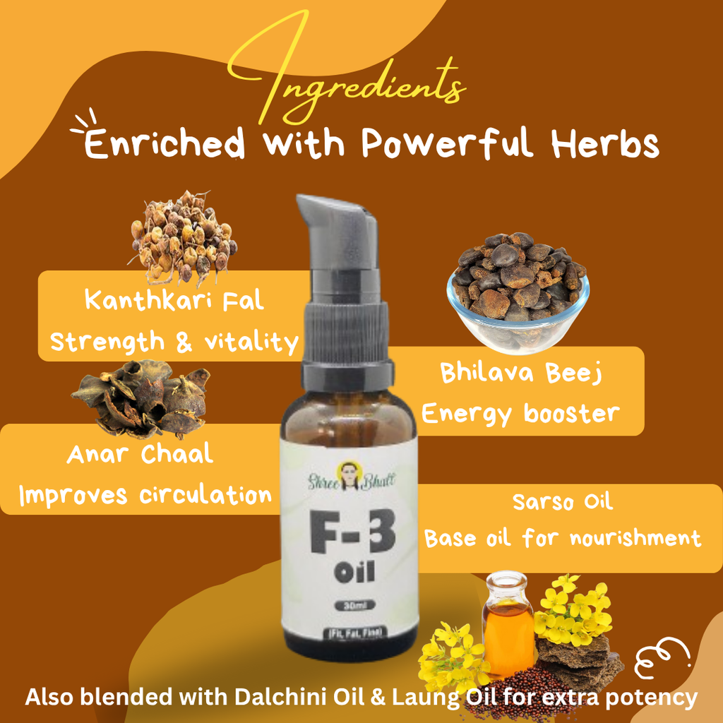 ShreeBhatt F-3 Oil is a 100% Ayurvedic herbal massage oil formulated to support male vitality, sexual health, Enriched with natural ingredients, this massage oil aids in increasing size and girth while promoting overall well being. Made with potent natural ingredients such as Kanthkari Fal, Bhilava Beej, Anar Chaal, Sarso ka Tel (Mustard Oil), Dalchini Oil, and Laung Oil (Clove Oil), this oil helps improve blood circulation, strength.