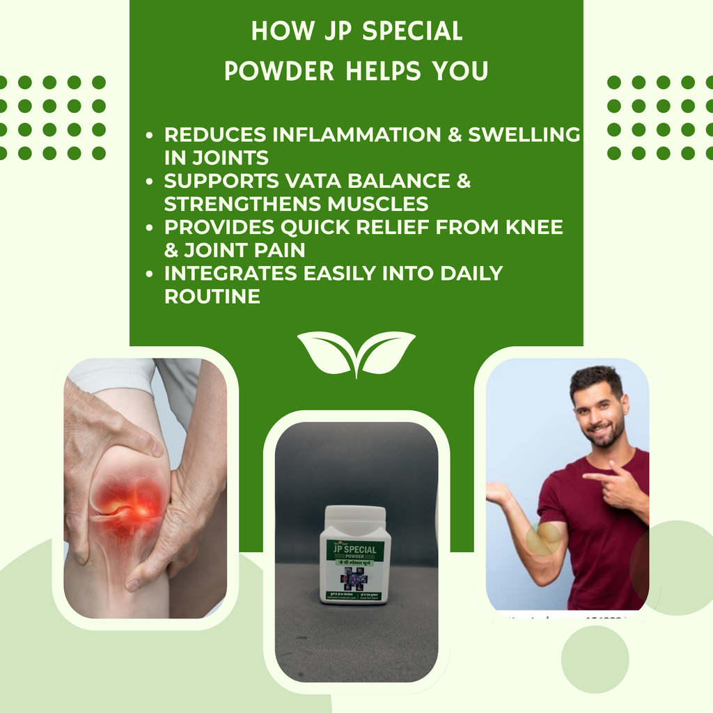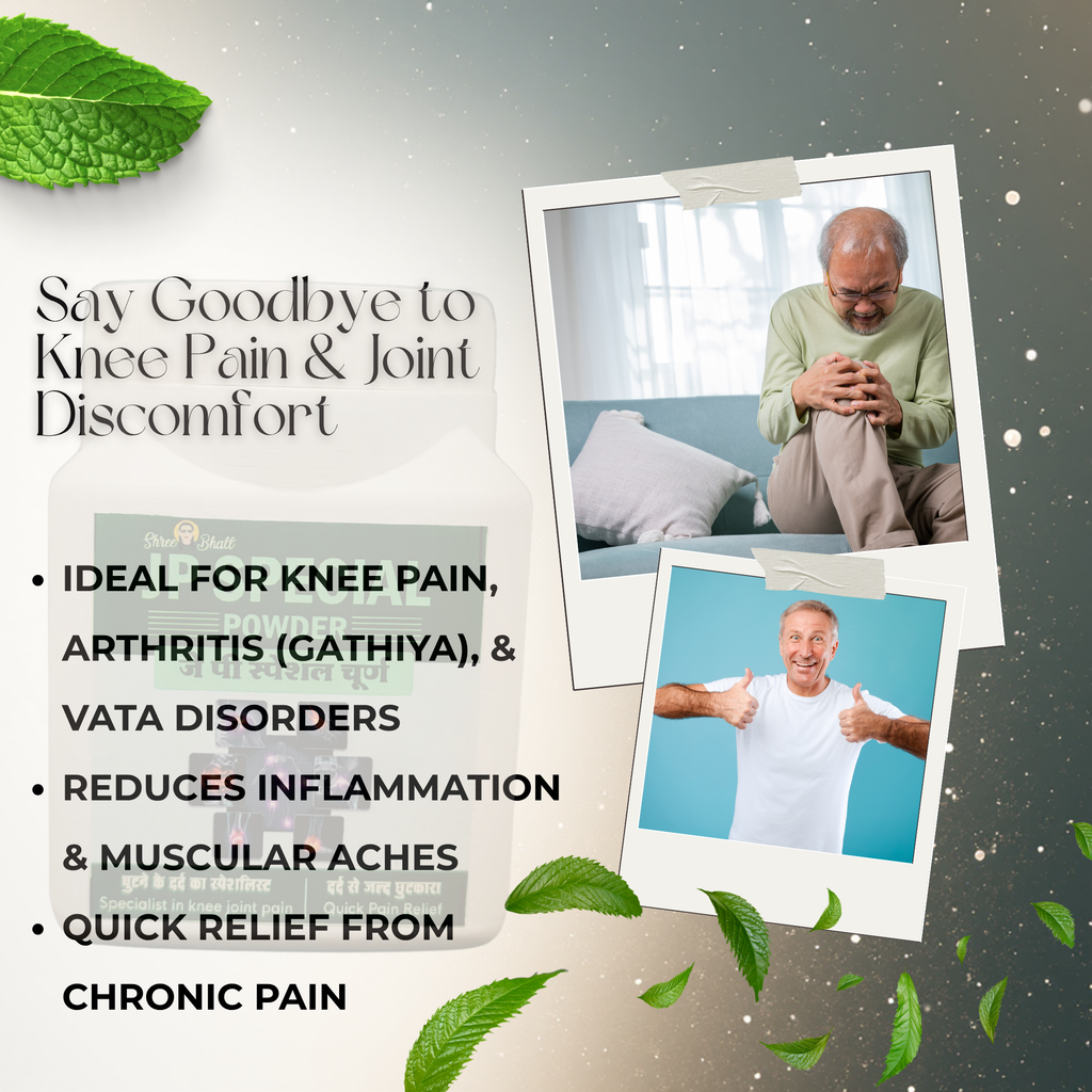 ShreeBhatt JP Special Powder is a targeted Ayurvedic formulation created especially for people suffering from joint pain (especially knees), Gathiya (arthritis / Vata disorders), inflammation, and muscular aches. This potent blend incorporates Acacia pods, Ashwagandha, and Rock Salt (Sendha / Himalayan salt) — each chosen for its time-tested ability to support joint health, reduce Vata imbalances, and provide quick relief from pain.