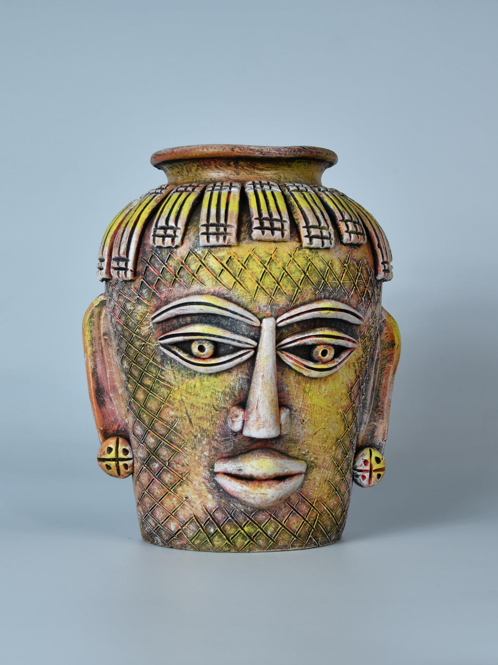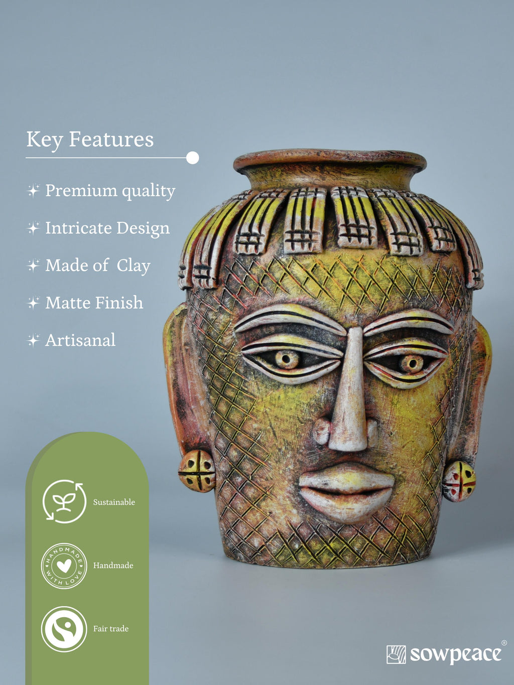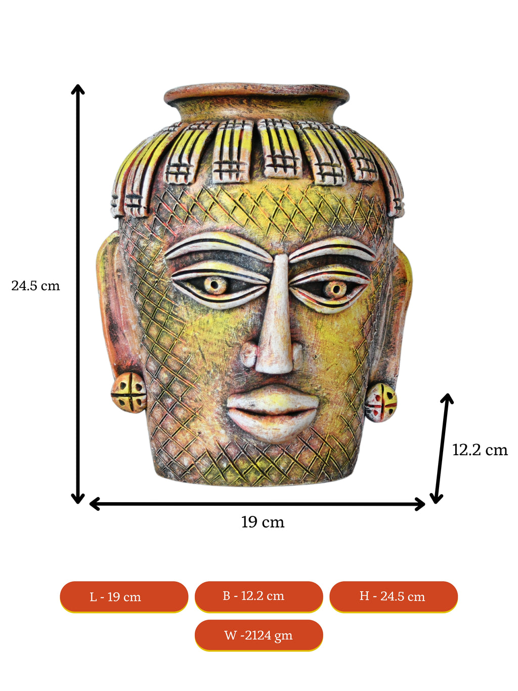 Elevate your home decor with Sowpeace's Big Male Vase, a terracotta masterpiece that exudes artistic charm and unique style. Made from natural terracotta, this vase stands at 19cm tall and measures 12.2cm in width and 24.5cm in height, making it the perfect size for displaying on a shelf, table, or mantel. The intricate tribal effigy design adds a touch of cultural flair to any room, making it a conversation starter and a statement piece. Each vase is handcrafted with care, ensuring that no two vases are exactly alike, making it a truly one-of-a-kind addition to your home. Bring a touch of nature and art into your home with Sowpeace's Big Male Vase. Add it to your collection or gift it to a loved one who appreciates unique and beautiful home decor. Order yours today and experience the beauty and charm of this terracotta masterpiece.