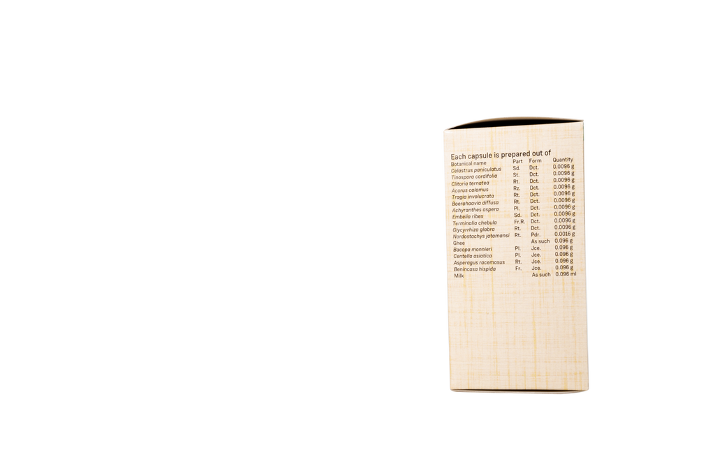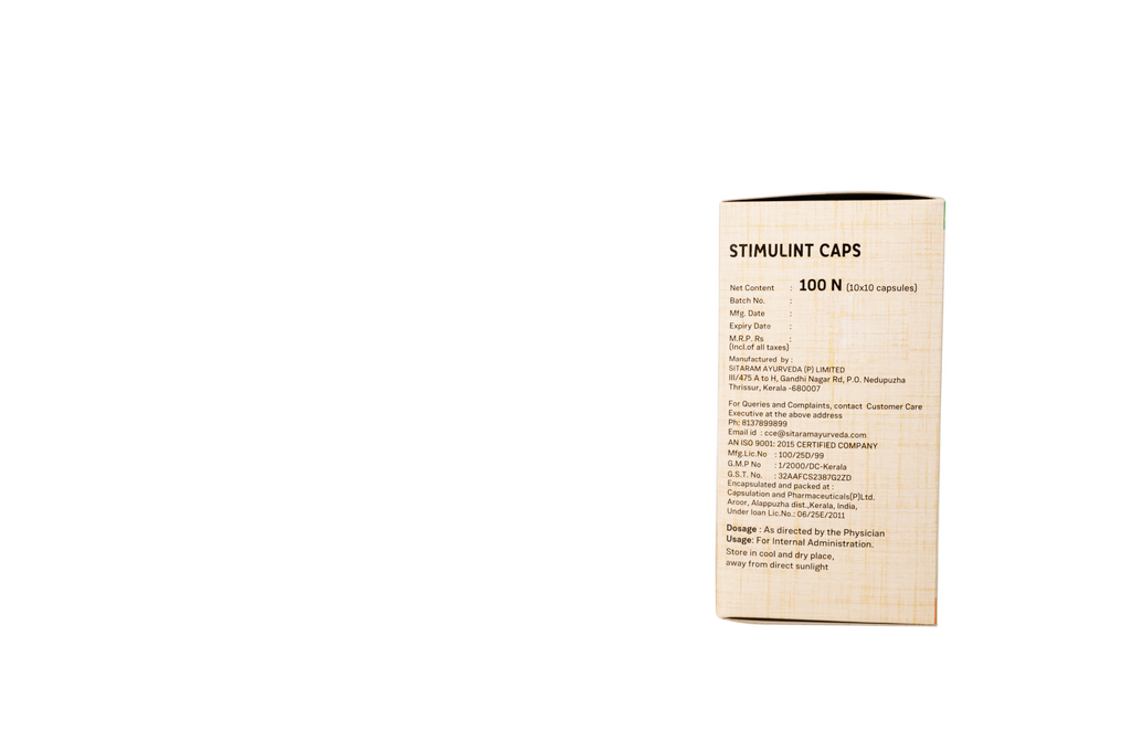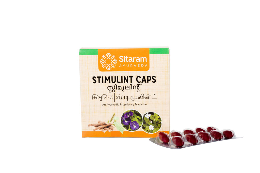 Stimulint is a combination of brain promoting herbs like Brahmi, Aparajitha, Vacha, Jyotishmati and Jatamansi that ‘stimulates the intellect’. Processed in ghee, it effectively crosses the blood-brain barrier, stimulates the brain tissue and strengthens its functions.A well-rested and calm brain is essential for improving mind function like intellect, memory and concentration. Stimulint taps into and modulates brain function to ensure physical and mental wellness.The easy to use capsule form is convenient for transportation and dosage.