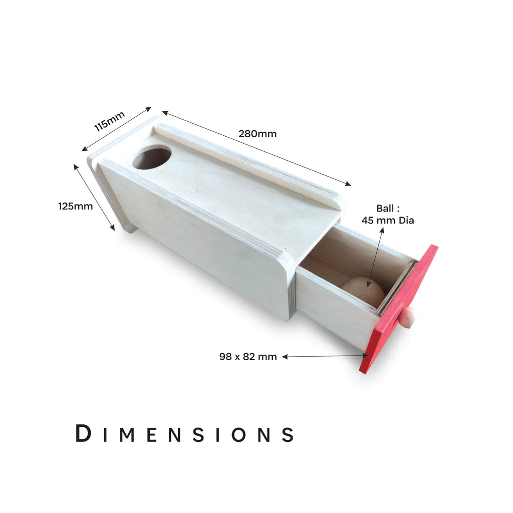Babies have difficulty understanding that the world exists beyond their point of view and expeirence.Young babies get upset when an object or mumma and puppa go out of sight for a minute. Piaget reffered to these mental images as schemas. A schema is a category of knowledge about something in this world for the baby. There are many versions of imbucare box but the underlying concept is object permanence. Woodbee's imbucare box of object permanence offers a cuboid with a drawer and a rolling ball. The ball is pushed through the hole. The shape is then retrieved by the baby in front of the box upon opening the drawer. It is a traditional montessori material and is quite fascinating for a baby who is in the sensorineural phase of developing object permanence. Also check our object permanence box level 1 with a tray.