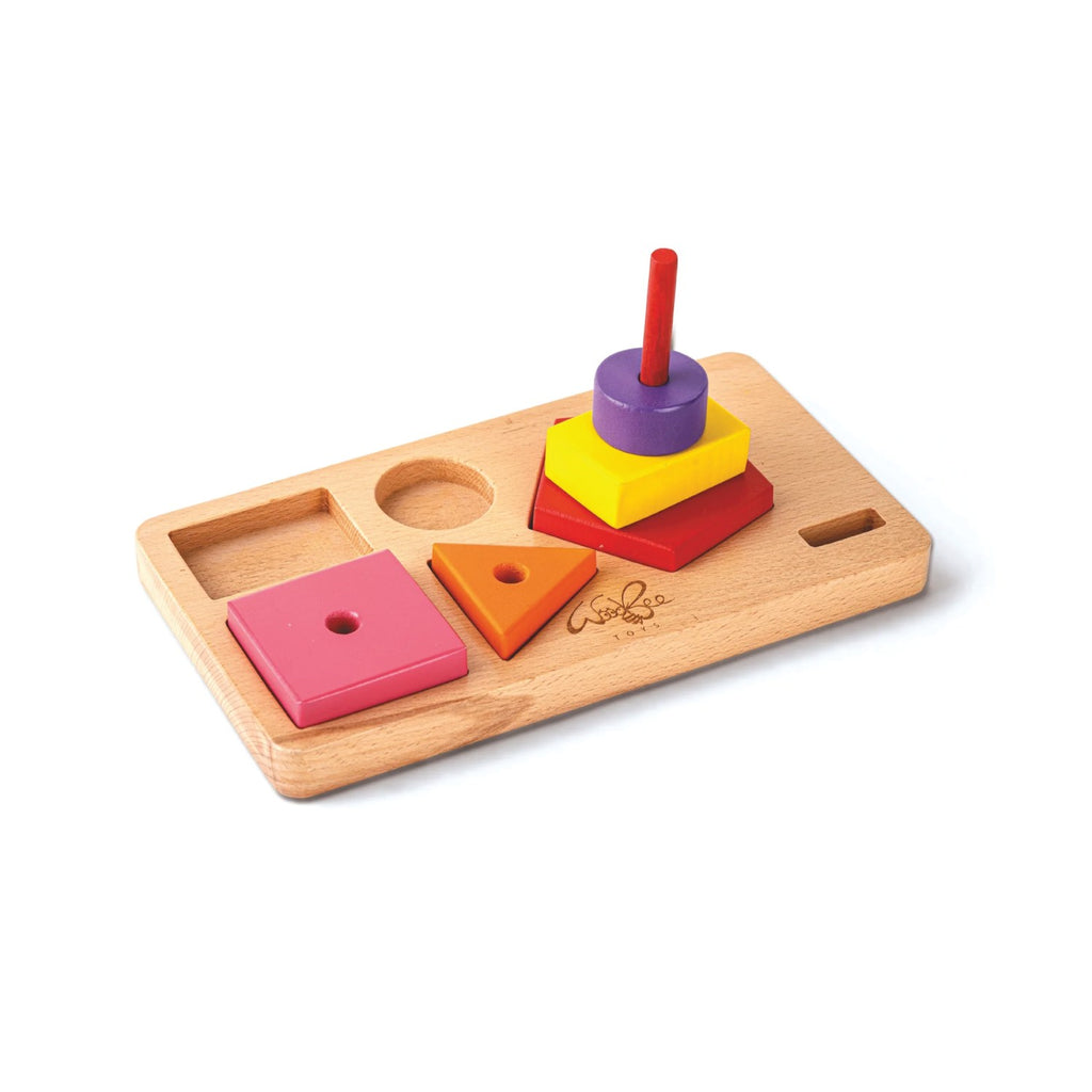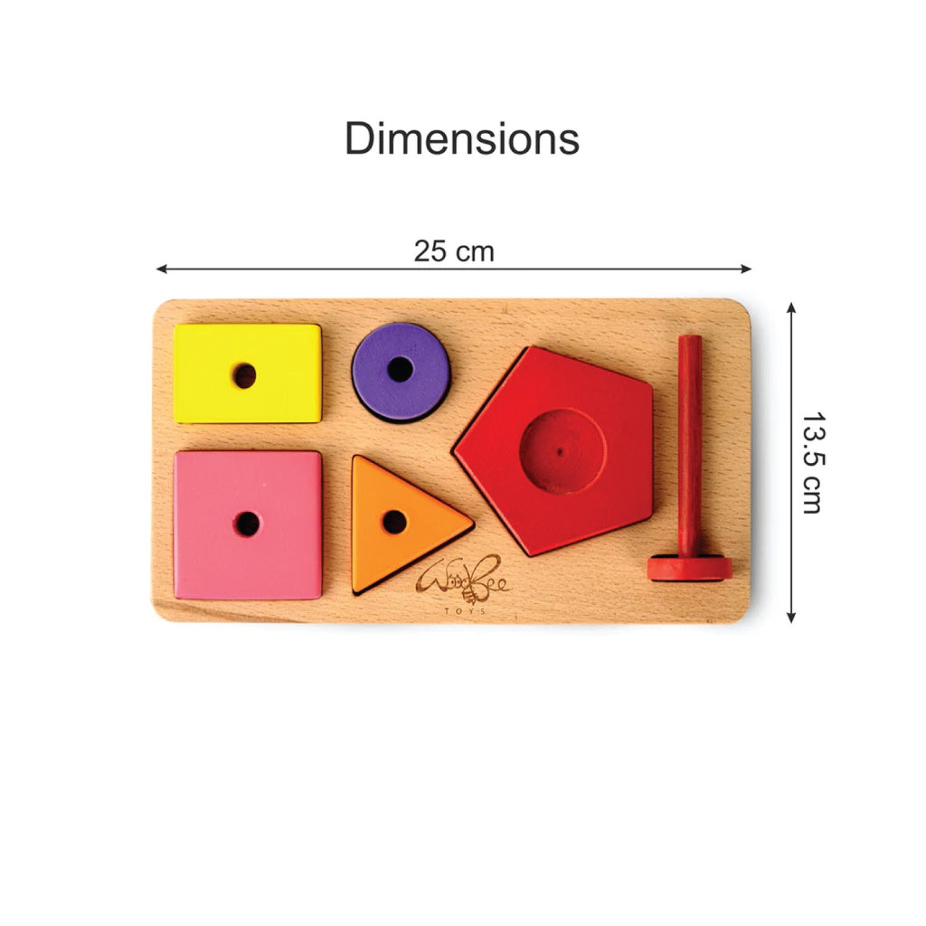 A stacking toy that also can be used as a shape and colour sorter, Woodbee's stacker cum sorter is a one toy with many benefits. The sorter has five different shapes in five different colours. Traingle,Square ,Pentagon,Rectangle,Circle/round . A Montessori material for early sorting, the stacker can be introduced as early as 8 months of age upto 3 years and beyond.The colourful shapes are chunky and can be easily stacked into the stalk with a circular base making it easy for baby to stacker.